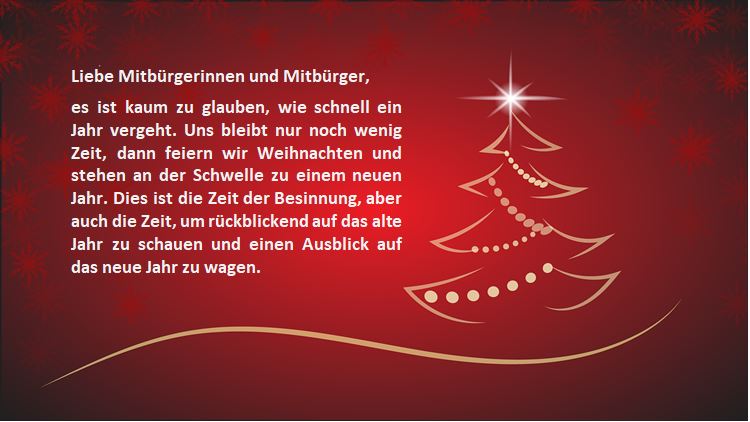 Ich wünsche allen Bürgerinnen und Bürgern von Herzen erholsame und besinnliche Weihnachten, einen guten Jahreswechsel und ein friedliches, erfolgreiches neues Jahr, vor allem aber Gesundheit.