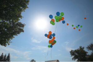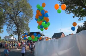 Pause in der Moderation: Luftballons steigen / Oktagon gibt Sicht frei auf die Kinder, die freundlich winken; wenn Oktagon unten weiter im Text